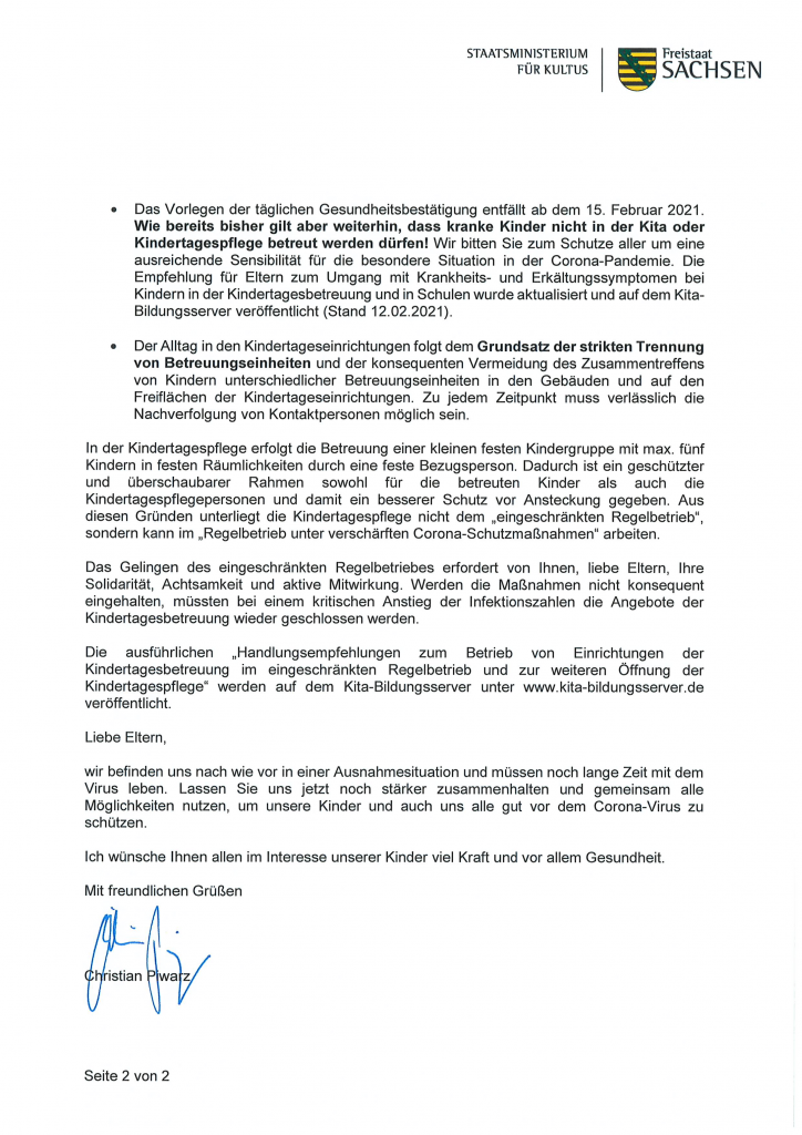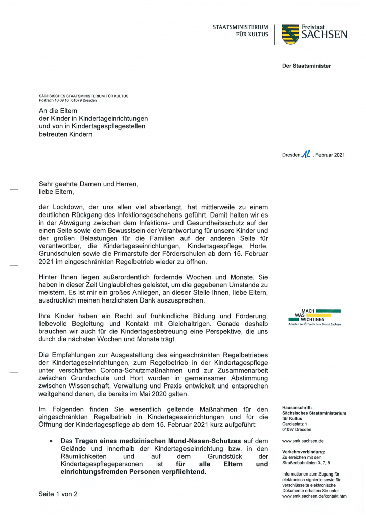 Für die Notbetreuung soll gemäß der zu erwartenden Allgemeinverfügung auf die bisher in Sachsen geltenden Regelungen abgestellt werden. Die neuen Anlagen für die Notbetreuung werden im Vorgriff auf die Allgemeinverfügung als Anlagen 2.1 und 2.2 diesem Tages-brief beigefügt. Bereits in den Schulen und Kindertageseinrichtungen vorliegende Arbeitgeberbescheinigungen können daher nach gegenwärtigem Kenntnisstand weiterhin verwendet, sofern sich an den dort bescheinigten Angaben keine Änderungen ergeben haben.